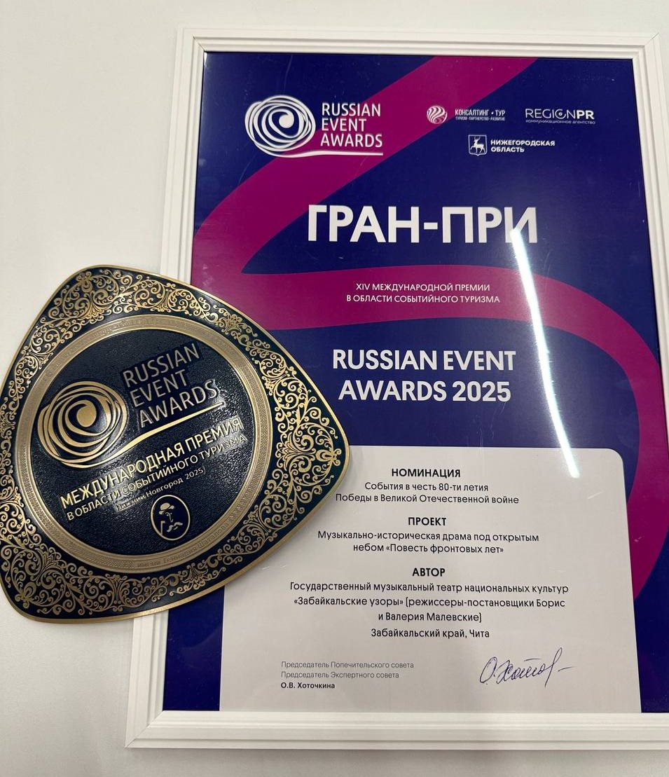 Музыкально-историческая драма «Повесть фронтовых лет», которую 9 мая на площади имени Ленина в Чите посмотрели почти 10 тысяч зрителей, выиграла Гран-при всероссийской премии Russian event awards в номинации «События в честь 80-летия Победы в Великой Отечественной войне». Церемония награждения лауреатов прошла 29 ноября в Нижнем Новгороде, сообщила в своём telegram-канале министр культуры Забайкальского края Алёна Ячменёва.