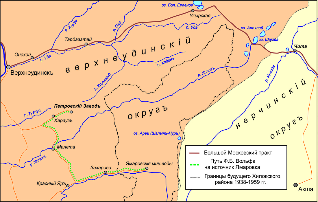 В музее отметили, что Фердинанд Вольф был первым, кто составил научно-медицинскую характеристику минерального источника Ямаровка (ныне село в Красночикойском округе, до 1963 года входило в состав территории Хилокского округа – авт.). Согласно карте, представленной на сайте Хилокского краеведческого музея, по пути к источнику декабрист побывал в селах Харауз, Малета Петровск-Забайкальского округа, Захарово Красночикойского округа, а также в предгорьях Малханского хребта в долине реки Чикой, на территории села Ямаровка.